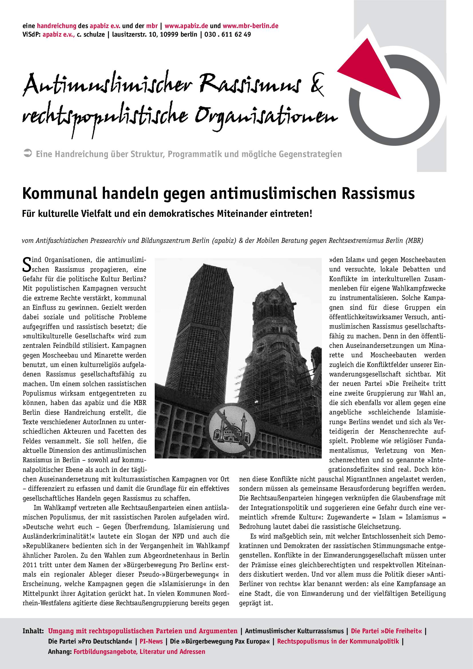Antimuslimischer Rassismus und rechtspopulistische Organisationen (2010); 24 Seiten; Hg.: apabiz e.V., MBR/VDK e.V.
