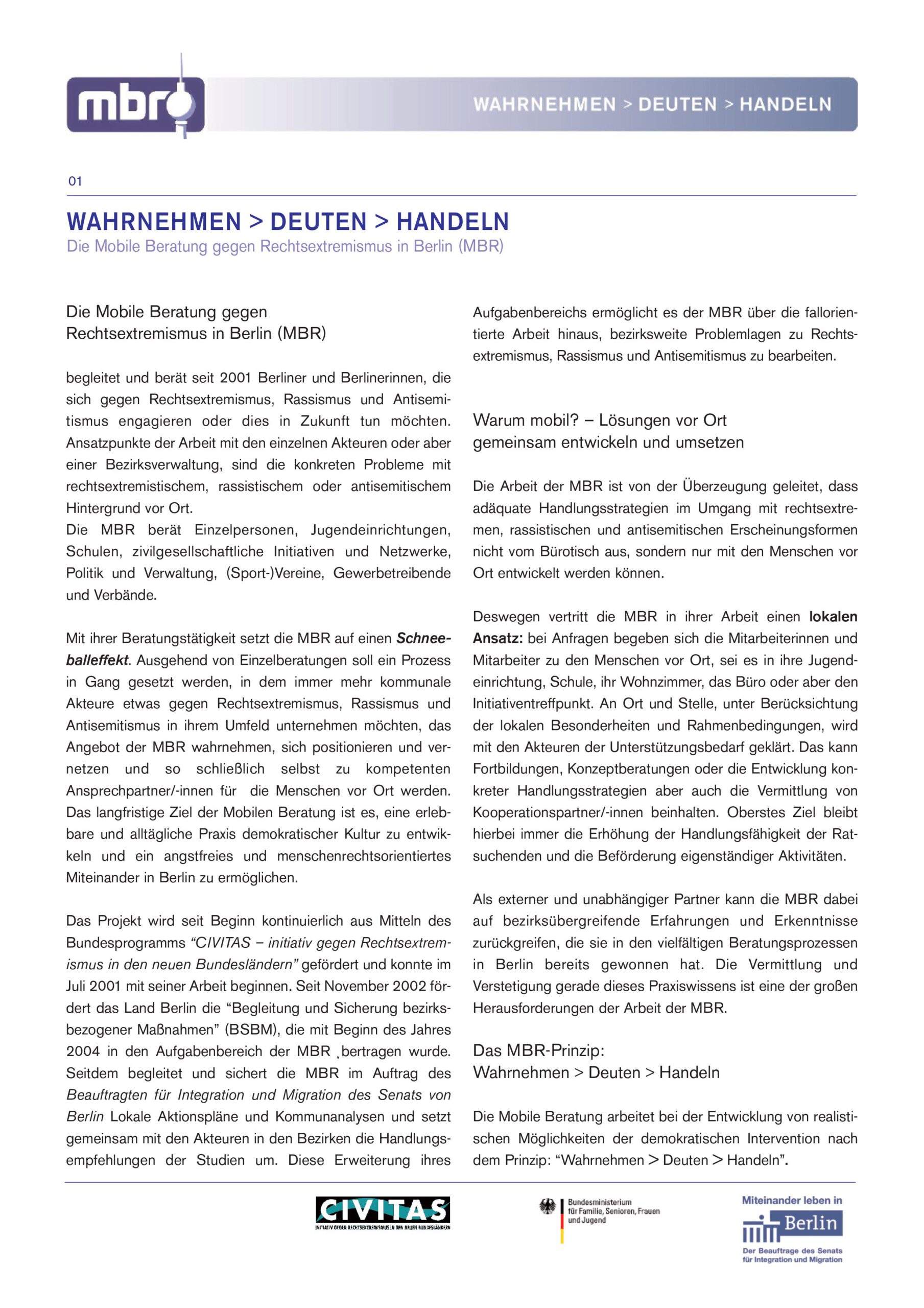 Wahrnehmen – Deuten – Handeln: Die Mobile Beratung gegen Rechtsextremismus in Berlin (2004/2007); 3 Seiten; Hg.: MBR/VDK e.V.