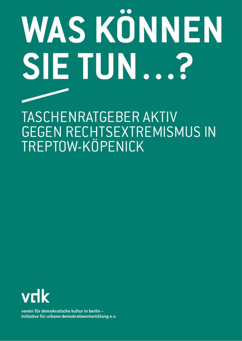 Was können Sie tun…? Taschenratgeber aktiv gegen Rechtsextremismus in Treptow-Köpenick (2010) Was können Sie tun…? Taschenratgeber aktiv gegen Rechtsextremismus in Treptow-Köpenick (2010); 48 Seiten; Hg. VDK e.V. Download