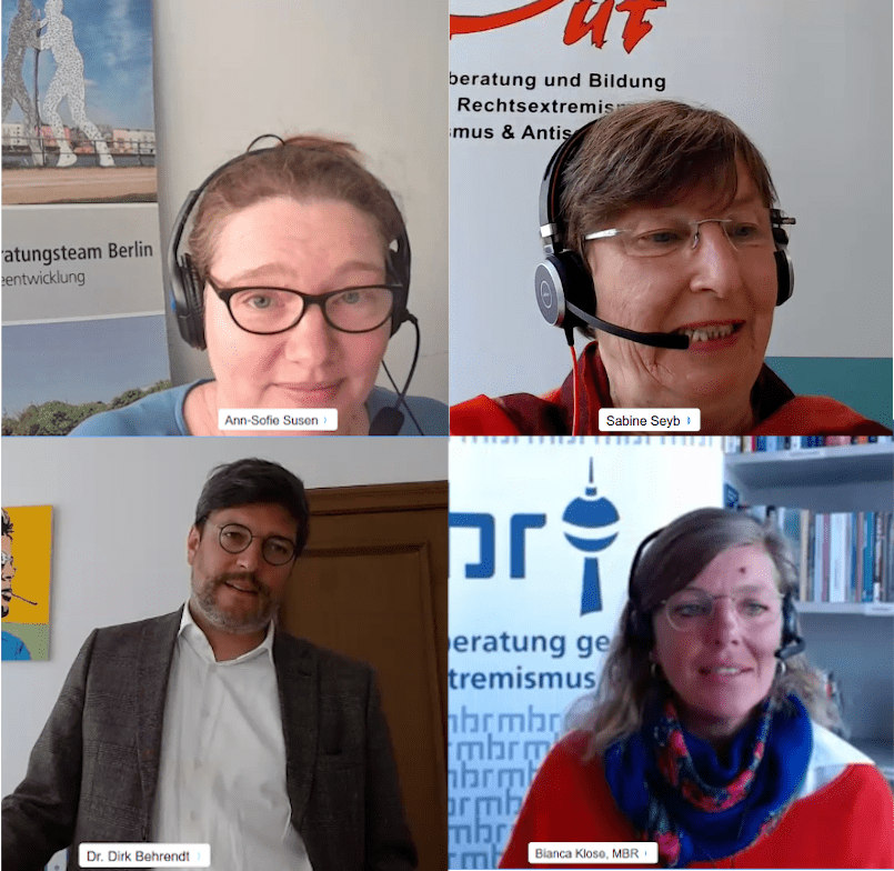 „Seit 20 Jahren leisten drei zivilgesellschaftliche Projekte einen herausragenden Beitrag gegen Rassismus, Antisemitismus und Rechtsextremismus in Berlin“, das würdigt die Senatsverwaltung für Justiz, Verbraucherschutz und Antidiskriminierung mit der heutigen Jubiläums-Pressekonferenz, auf der neben MBR-Projektleiterin Bianca Klose auch Justizsenator Dr. Dirk Behrendt, Sabine Seyb von ReachOut Berlin und Ann-Sofie Susen vom Mobilen Beratungsteam Berlin – für Demokratieentwicklung der Stiftung SPI (MBT Berlin) gesprochen haben.